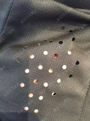 服裝面料通過(guò)激光切割打孔技術(shù),使透氣孔快速在上述服裝上成型,并且透氣孔的邊緣整齊,不會(huì)出現(xiàn)拖絲、掛絲、漏絲等現(xiàn)象。本實(shí)用新型的有益效果是通過(guò)激光切割打孔技術(shù),在...