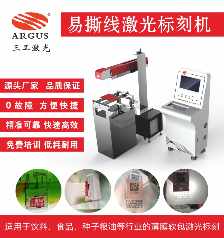 激光標刻易撕線技術(shù)的應(yīng)用越來越普遍,廣泛的行業(yè)應(yīng)用促使激光加工技術(shù)飛速發(fā)展,激光刻線在薄膜軟包易撕線加工上的應(yīng)用也是日新月異,激光加工成為了PE、PVC、PET薄膜加工行業(yè)新型的工藝領(lǐng)導者。武漢三工激光是國內(nèi)率先針對薄膜包裝行業(yè)提出激光代替機械加工工藝的企業(yè),專為薄膜易撕線、定量透氣孔設(shè)計,打標速度快,設(shè)備易操作,性能穩(wěn)定,使用壽命長等。SCM-55集合了激光技術(shù)、光學技術(shù)、精密機械、電子技術(shù)、計算機軟件技術(shù)以及制冷等學科于一體的高科技產(chǎn)品,與傳統(tǒng)的機械齒輪壓孔相比速度更快,孔徑孔距大小可調(diào)更加均勻,可實現(xiàn)任意方向、形狀,多條易撕線標刻。