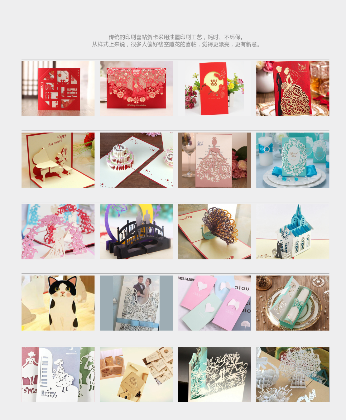 在眾多的印刷制品中特別的存在,那就是各類裝飾卡片,酒杯裝飾卡,果汁杯卡、蛋糕插牌等等,小小的卡片點(diǎn)綴著我們的生活。單一的造型很難滿足大眾的審美需求,個(gè)性化的定制廣受歡迎。各類裝飾卡激光鏤空雕刻機(jī),可以輕易的模切任意復(fù)雜的圖案,不受設(shè)計(jì)限制,個(gè)性化定制成本大大降低,并且激光鏤空模切的裝飾卡片精美獨(dú)特。
