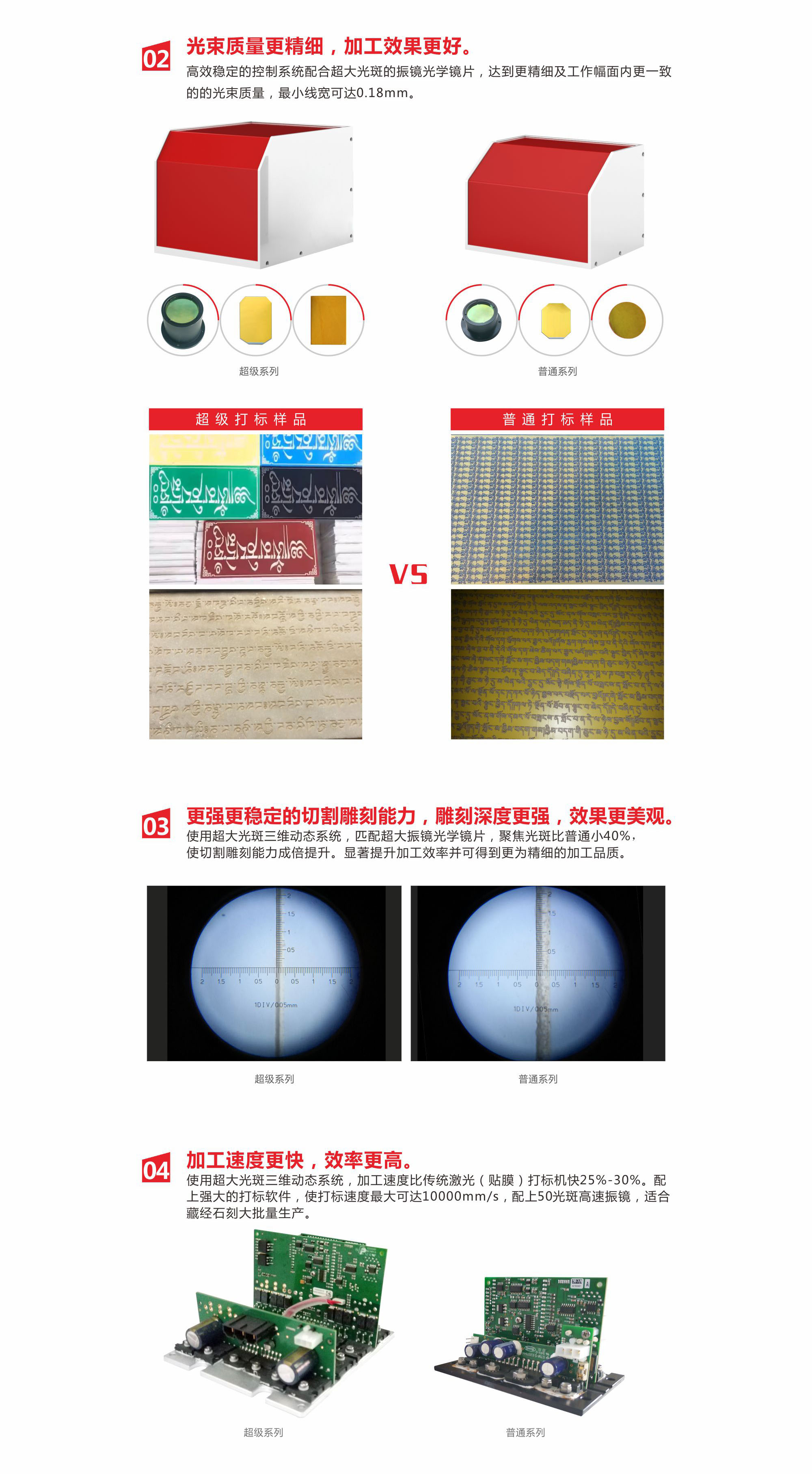 3、更強(qiáng)更穩(wěn)定的切割雕刻能力,雕刻深度更強(qiáng),效果更美觀。使用超大光斑三維動(dòng)態(tài)系統(tǒng),匹配超大振鏡光學(xué)鏡片,聚焦光斑比普通小40%,使切割雕刻能力成倍提升。 顯著提升加工效率并可得到更為精細(xì)的加工品質(zhì)。