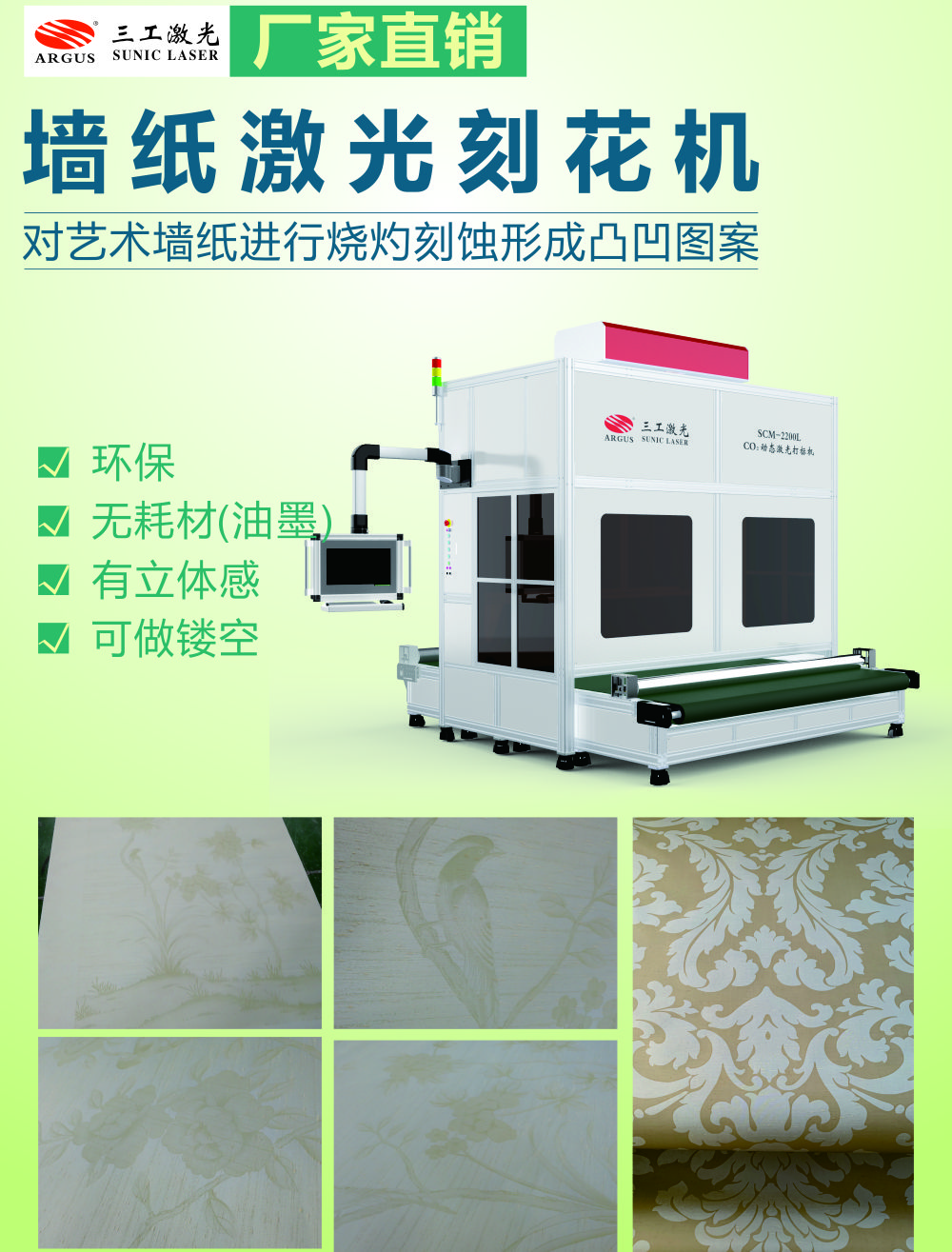 墻布上的花紋圖案也可以用激光打標(biāo)機來加工了,利用激光的熱效應(yīng),無接觸的對面料進行燒灼刻蝕,并形成凸凹有致的花型圖案。