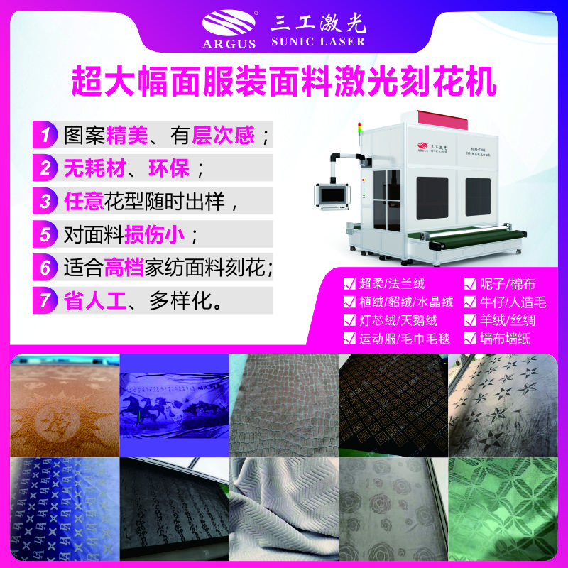 由于國家的環(huán)保政策日益嚴(yán)苛,傳統(tǒng)的爛花、絲網(wǎng)印花工藝處于逐漸淘汰的趨勢(shì),絲網(wǎng)印花逐步被熱轉(zhuǎn)印花取代,而伴隨著激光刻花的不斷升級(jí)完善,完全能替代部分爛花和壓花的工藝,特別是針對(duì)于短毛絨布。