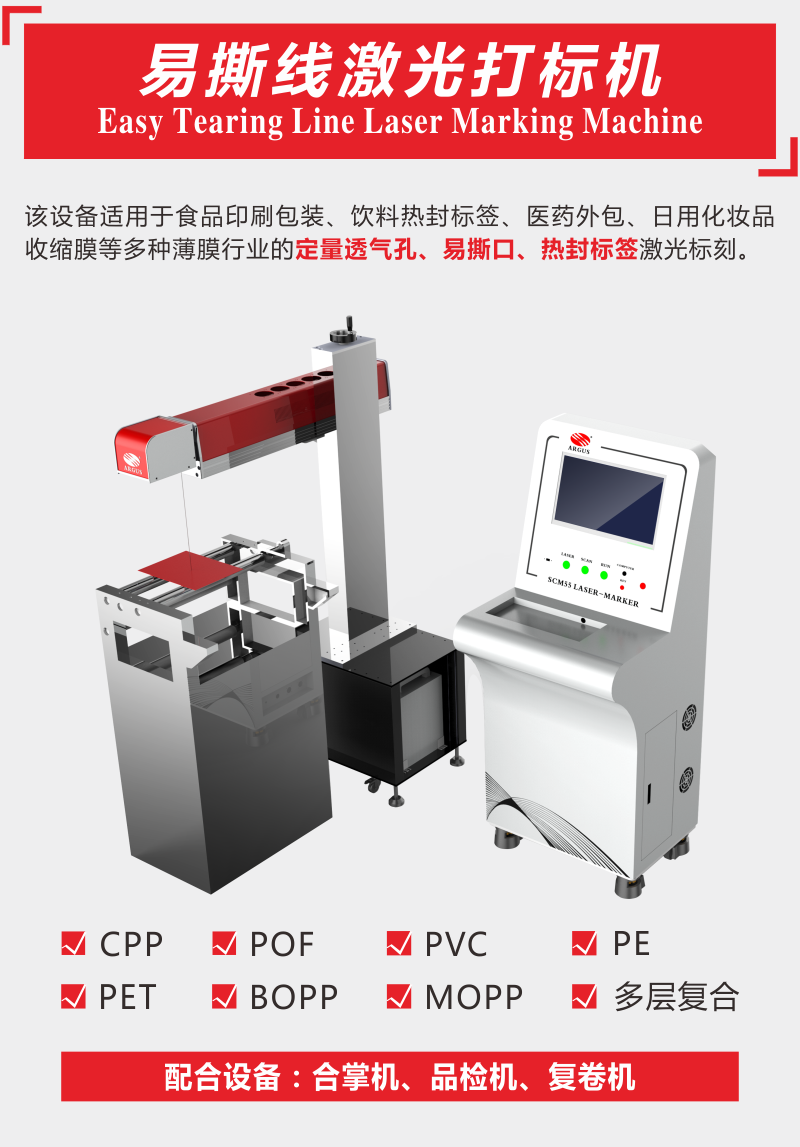 激光加工技術(shù)的應(yīng)用越來越廣泛,目前我公司針對(duì)塑料薄膜包裝易撕線運(yùn)用激光加工。易撕線激光切割機(jī),可以加工的材料以及行業(yè)非常廣泛,可用于PE、PVC、PET、OPP、塑料、鋁箔 、防靜電/屏蔽袋、抽真空袋、鋁箔面膜、寵物雜糧袋、塑料粒紙鋁塑復(fù)合袋、微孔紋真空袋、建材包裝袋、防潮袋、封口膜等包裝材料的易撕線易撕口的加工,專業(yè)易撕線激光劃線設(shè)備,專為薄膜包裝行業(yè)而生。除此之外還可進(jìn)行熱封標(biāo)簽透氣孔,定量透氣孔的加工!