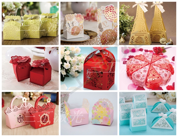 紙品激光鏤空機(jī)雕刻喜糖盒、立體賀卡最新樣品