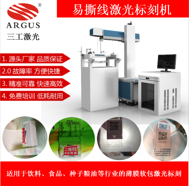 使用激光設(shè)備來(lái)改進(jìn)包裝袋的易撕口工藝,是由三工激光率先提出并且已成功運(yùn)用在很多包裝袋生產(chǎn)廠家。激光標(biāo)刻易撕口工藝用在面膜包裝袋上,主要體現(xiàn)在將易撕口改變成易撕線,激光在面膜包裝帶上打上一排微型的虛線孔,讓消費(fèi)者能整齊而又方便的撕開(kāi)面膜包裝袋。而且由于面膜包裝袋由多層復(fù)合材料組成,并且有密封和阻隔要求,激光標(biāo)刻機(jī)可以精準(zhǔn)的控制激光打孔的深度從而只打半透的虛線孔,既保證了包裝袋的完成性又讓包裝袋美觀易撕。
